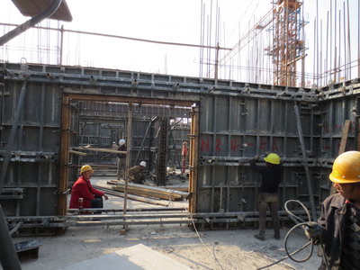 8号楼四层剪力墙钢模板安装,9号楼四层楼板木模板安装