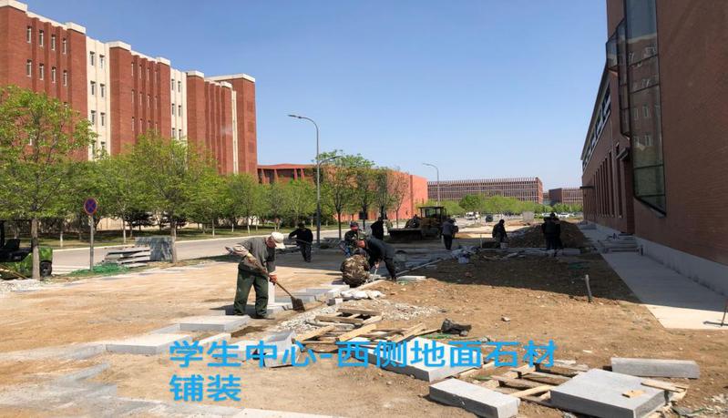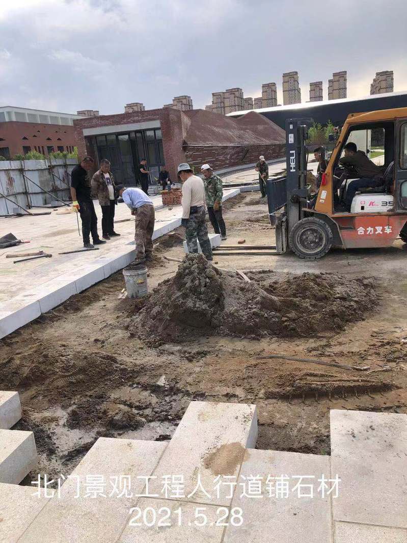 挖电缆沟,安装手孔井,回填管沟,苗木浇水,弱电井盖安装,人行道平整砂砾,人行道绑钢筋,支模板,浇筑混凝土及混凝土养生,人行道铺石材。