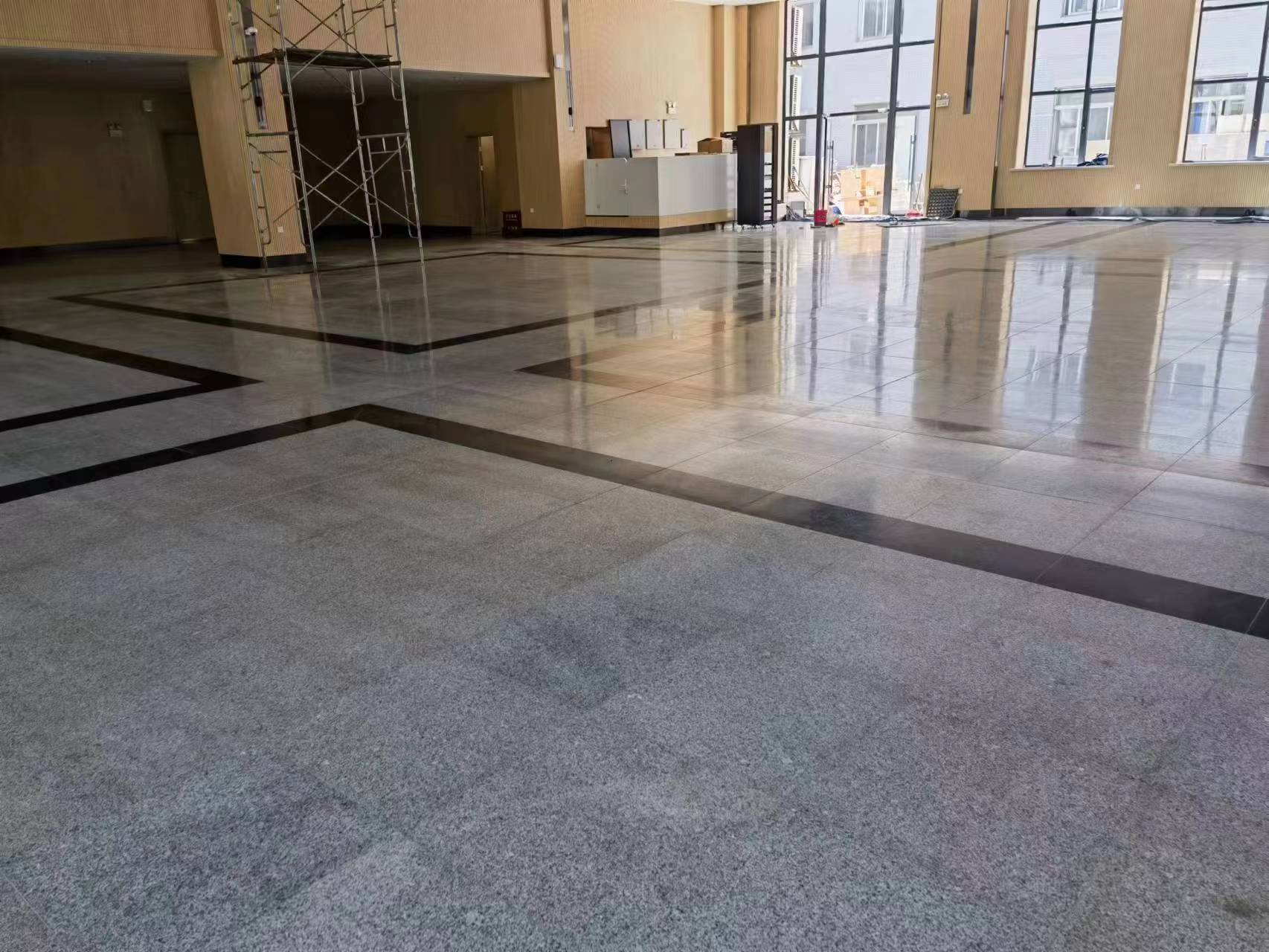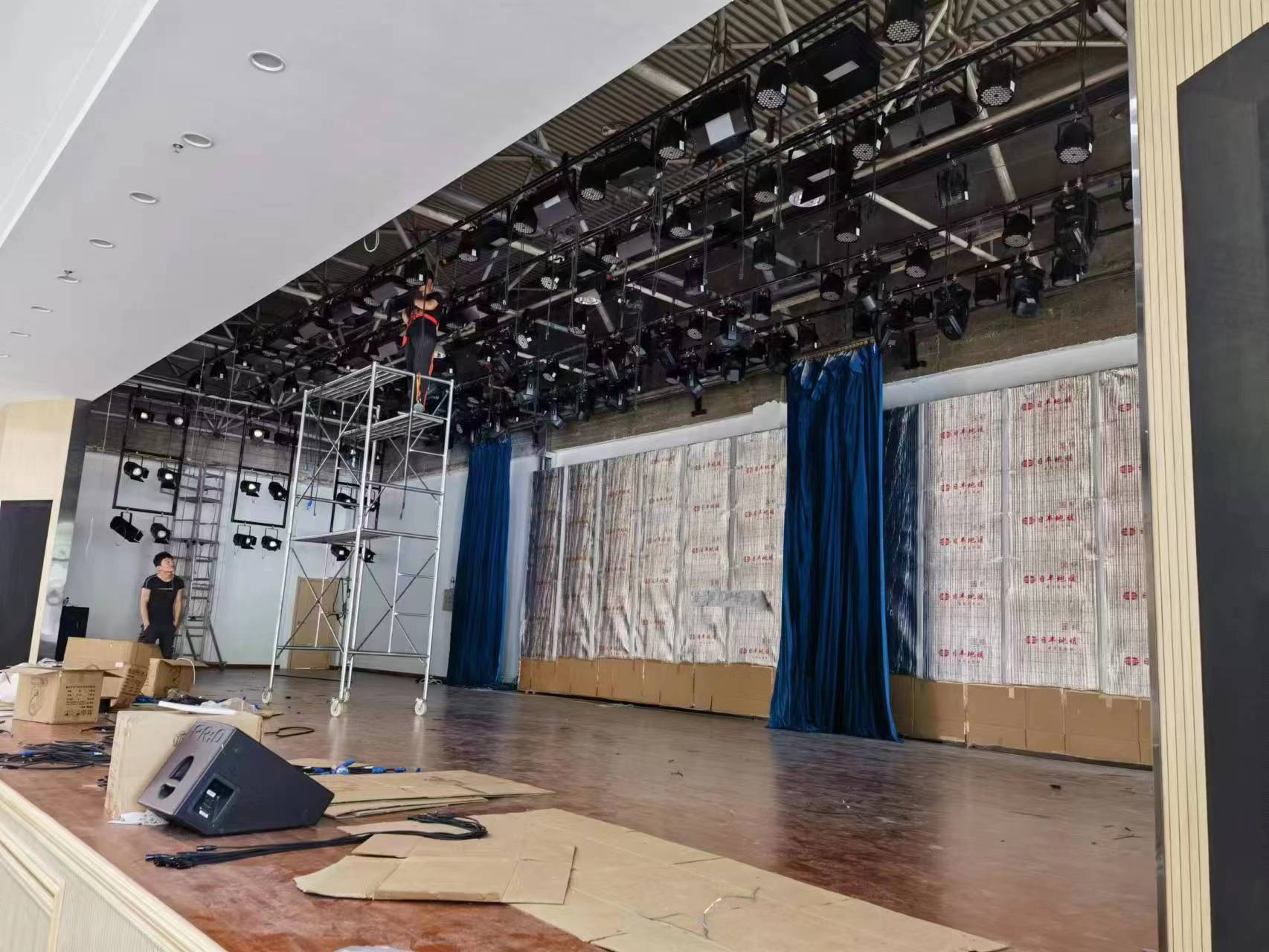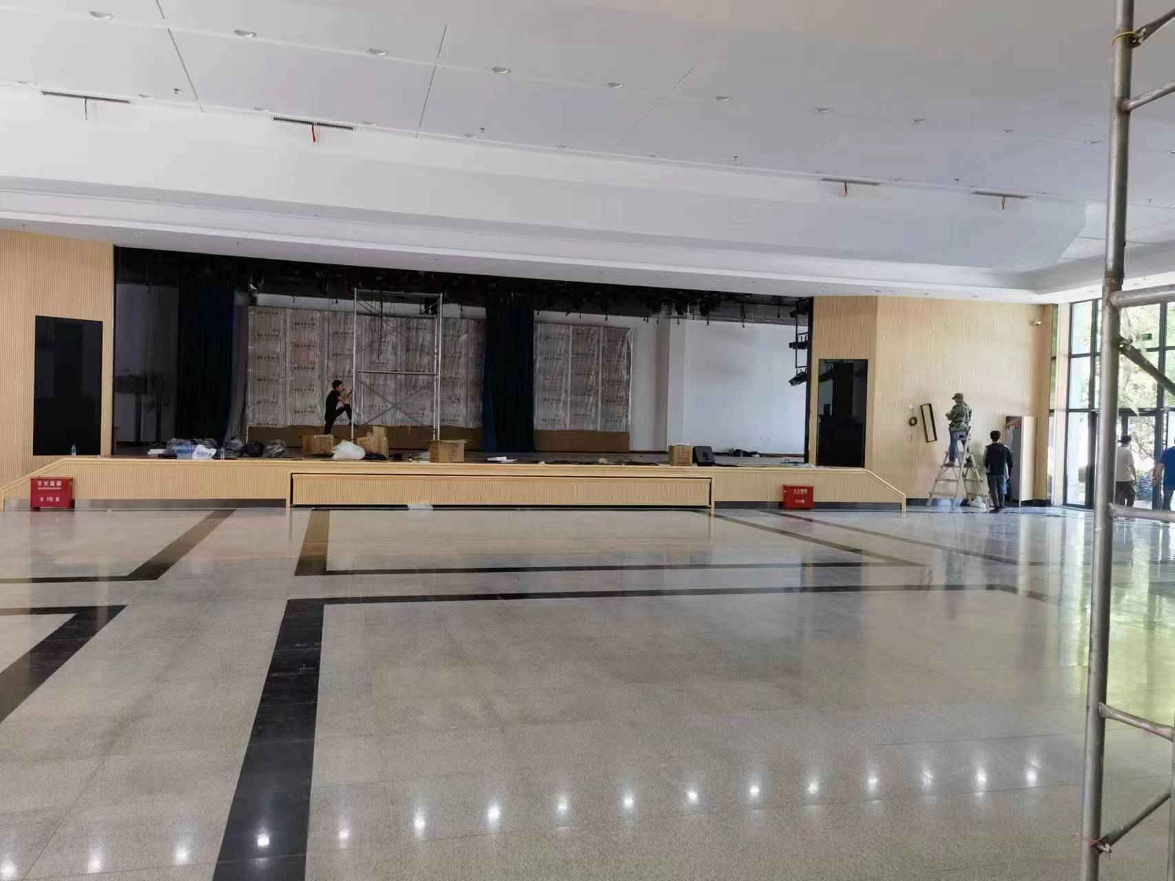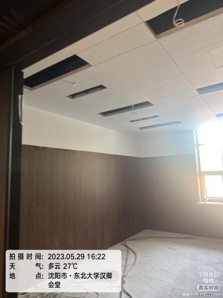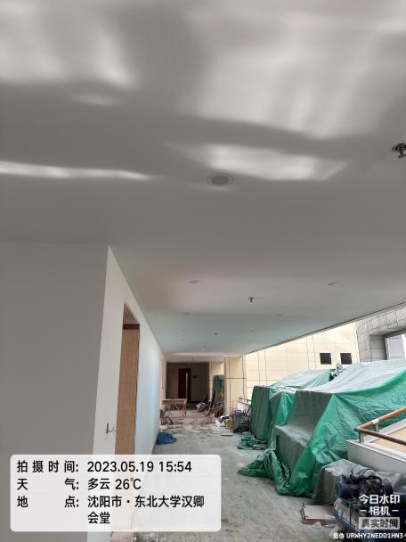 施工进度:三、四层天棚恢复完成、灯具风口安装完成,三、四层房间装修完成;一层房间天棚大白完成、灯具风口未安装,一层房间墙面施工完成,一层房间地面未施工,原地胶地面未拆除;报告厅墙面施工完成;室外管沟施工完成,沥青路面恢复完成。