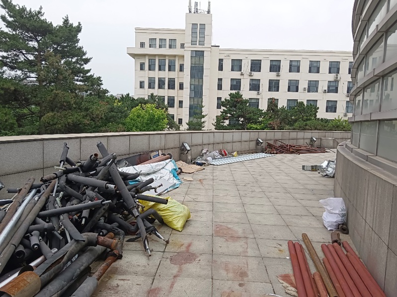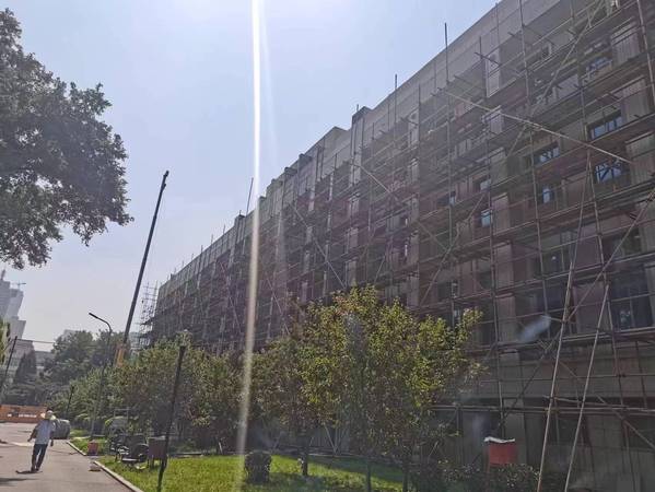 施工进度:脚手架搭设,东立面、东北角、东南角搭至四层。西立面脚手架加固,西立面拆除30%,管内四层书架防护。